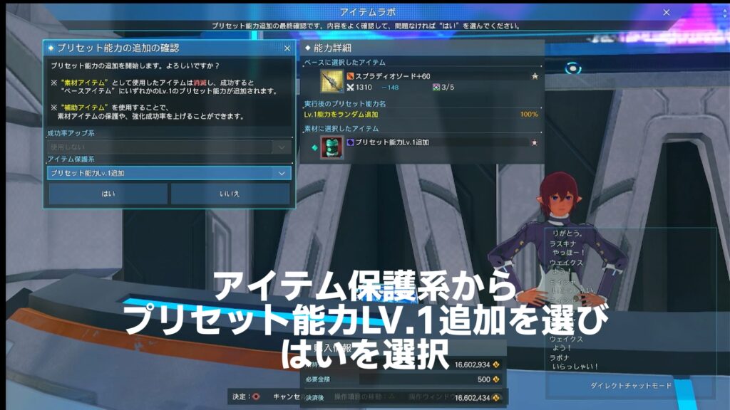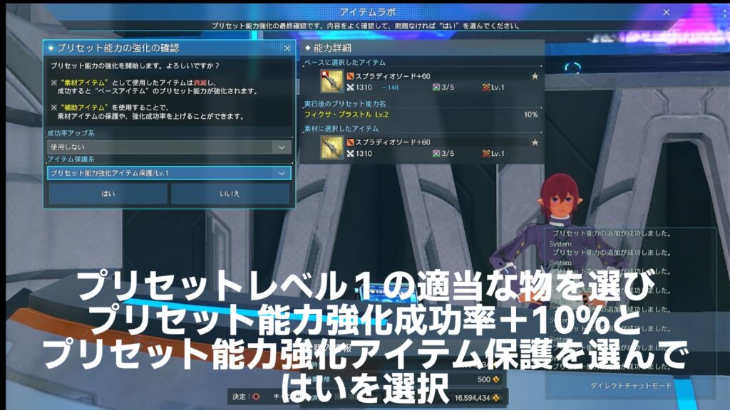 プリセット能力強化成功率10%とプリセット能力強化アイテム保護LV1を使ってはいを選択(成功率20%)