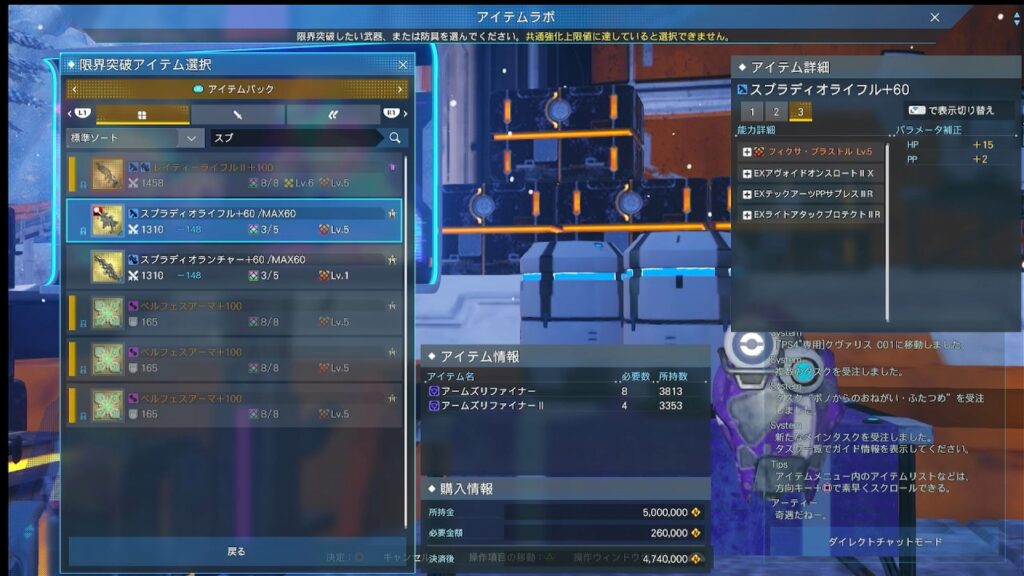 スプラディオの限界突破は26万メセタ×4回で104万メセタかかりました。