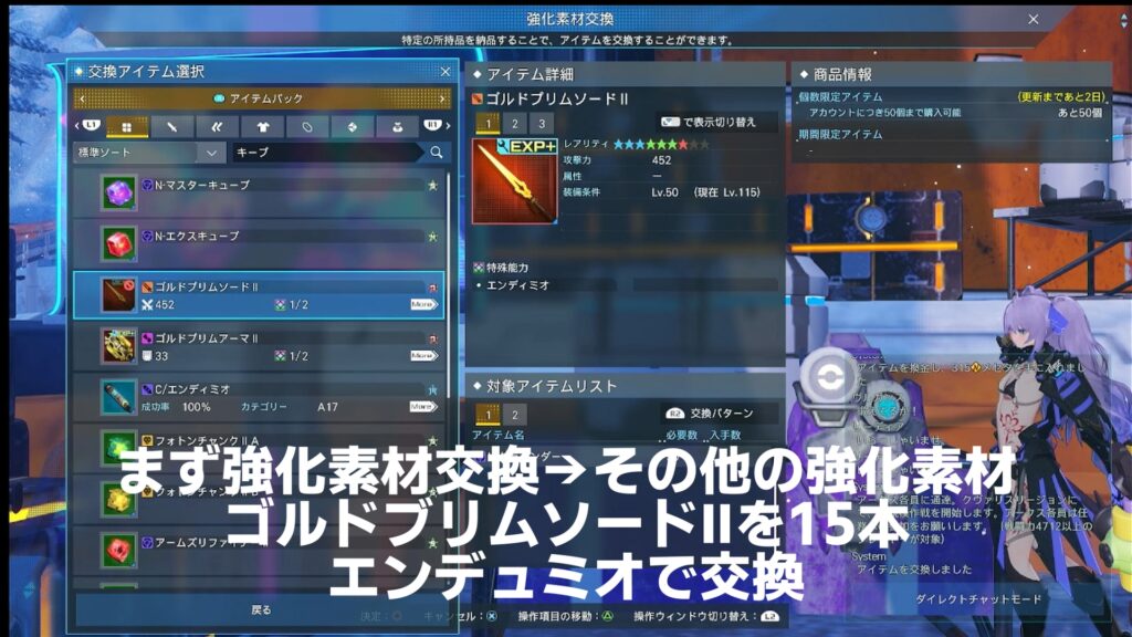 必要な物はシーズンイベントでポイント交換できるゴルドブリムアーマーⅡ+60が12本 アイテムラボで交換できるゴルドブリムソードⅡが30本です