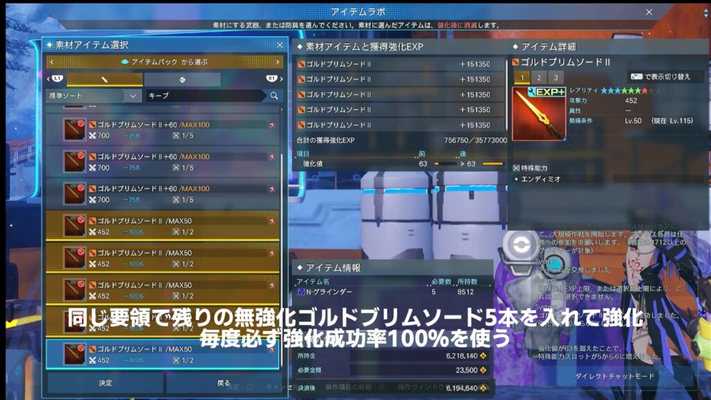 2.先ほど強化でできたLV63ゴルドブリムソードⅡに残りの無強化ゴルドブリムソードⅡ5本を入れる。