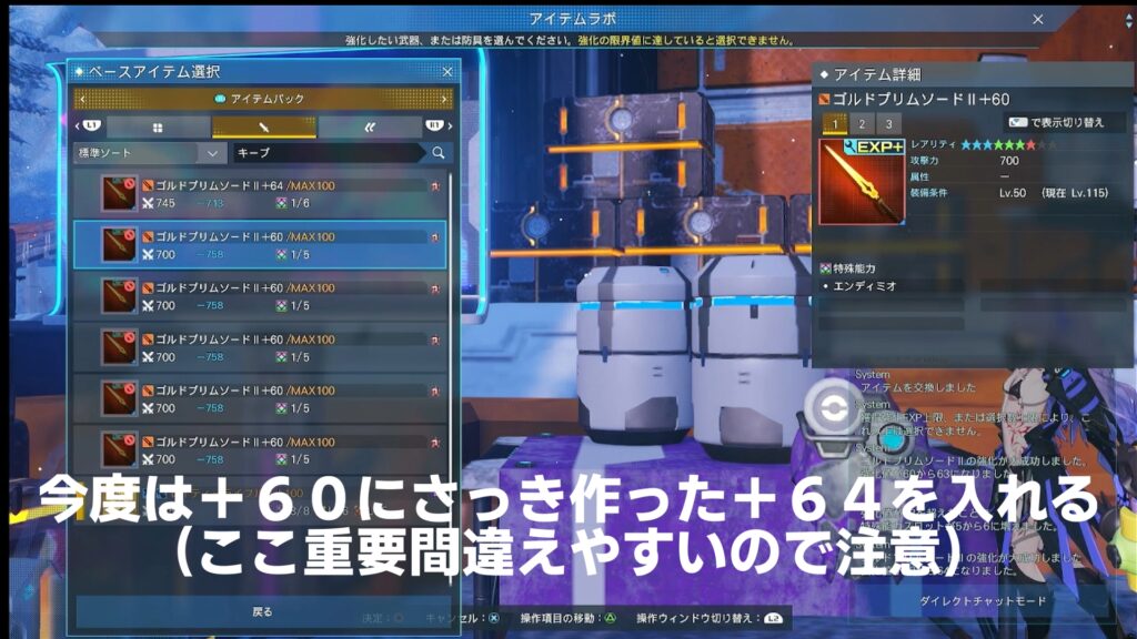 3.次に今度は+60のゴルドブリムソードⅡにさっき強化でできたゴルドブリムソードⅡ+64を入れる